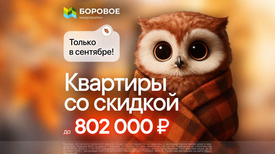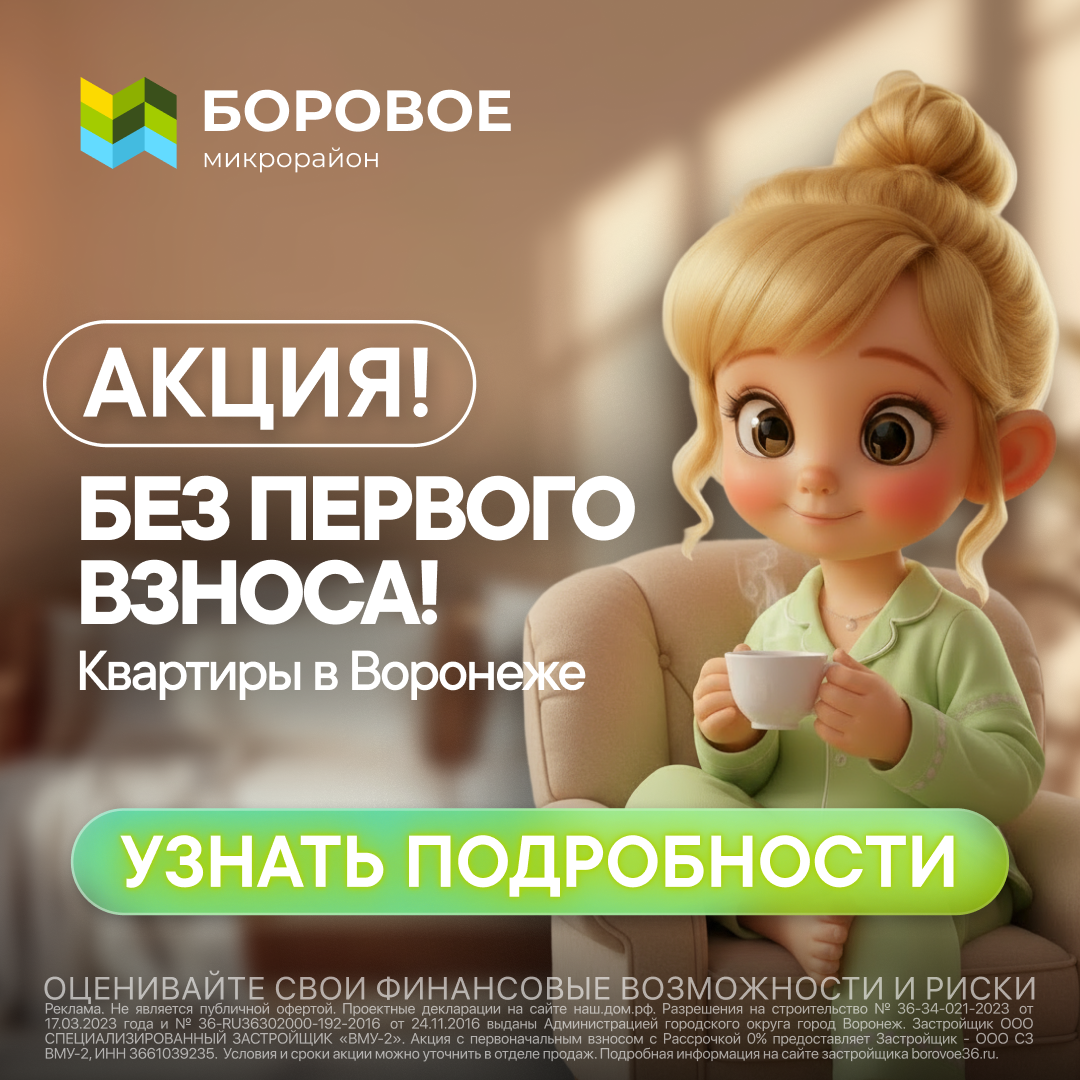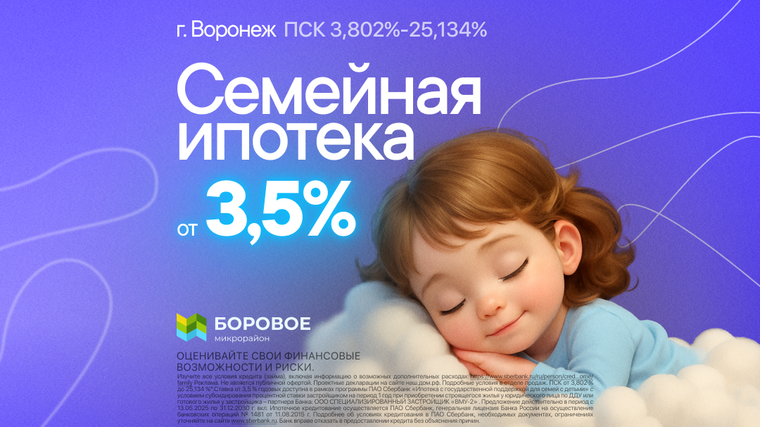 🏢 Офис продаж: г. Воронеж, ул. Сельская 2/2 _________________________________________________________ Полная стоимость кредита рассчитывается от 3,802 % до 25,134 %*. Ставка от 3,5 % годовых доступна в рамках программы ПАО Сбербанк «Ипотека с государственной поддержкой для семей с детьми» с условием субсидирования процентной ставки застройщиком на период 1 год при приобретении строящегося жилья у юридического лица по ДДУ или готового жилья у застройщика – партнера Банка: ООО СПЕЦИАЛИЗИРОВАННЫЙ ЗАСТРОЙЩИК «ВМУ-2». Предложение действительно в период с 13.05.2025 по 31.12.2030 г. вкл. Ипотечное кредитование осуществляется ПАО Сбербанк, генеральная лицензия Банка России на осуществление банковских операций № 1481 от 11.08.2015 г