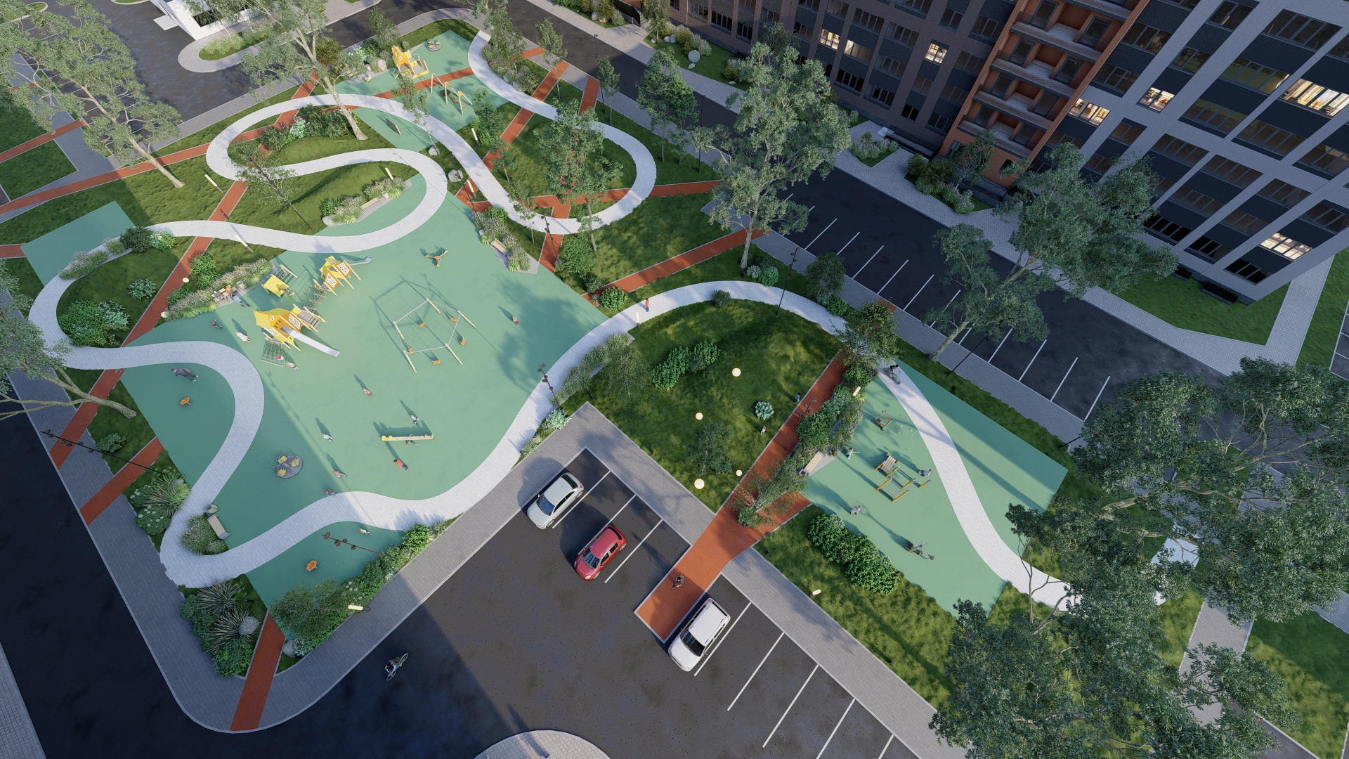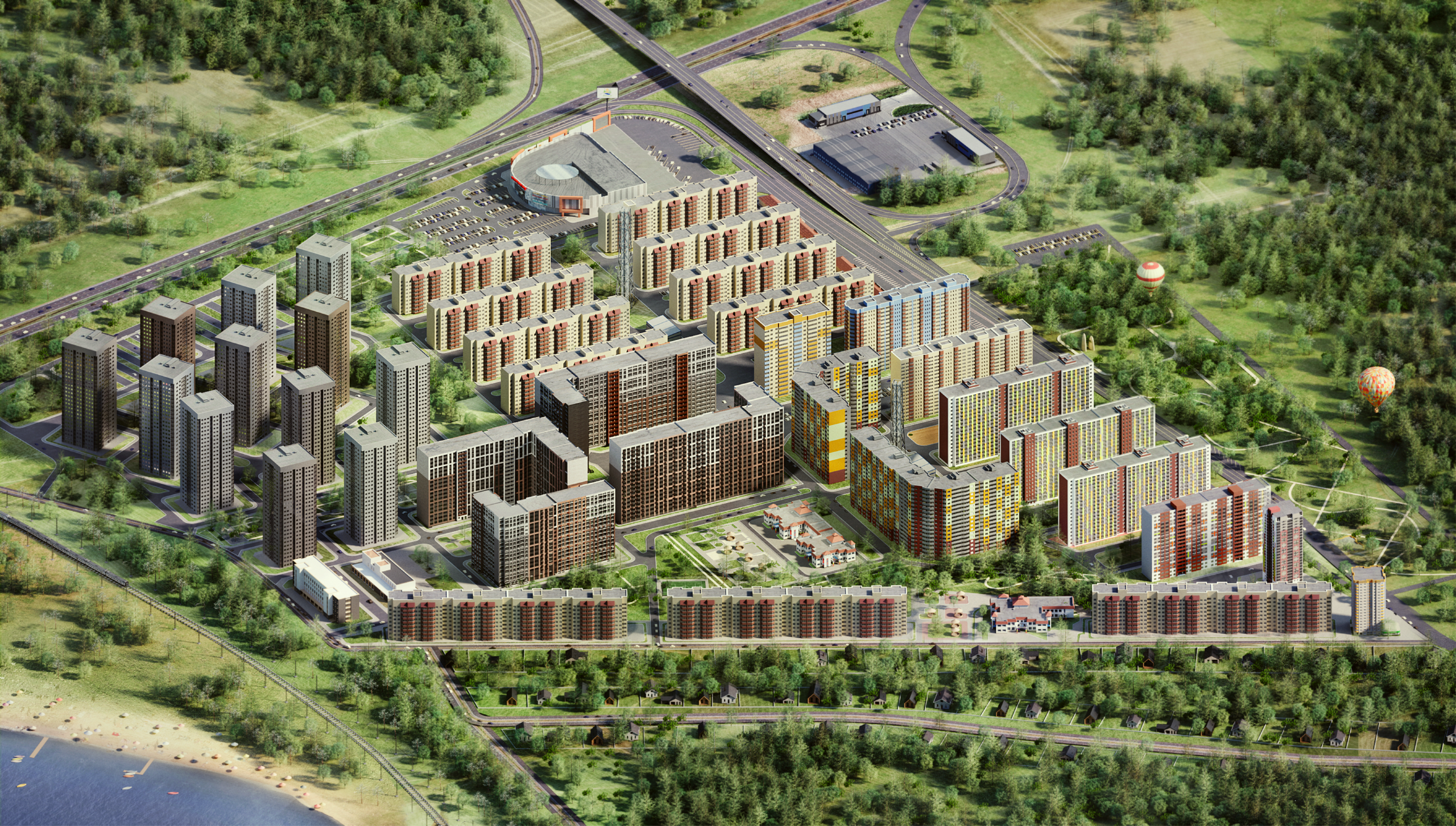 Авторская архитектура с современным подходом к проектированию домов. Благоустройство прилегающей территории включает в себя организацию детских и спортивных площадок, зон отдыха и озеленение. Рядом лесопарковая зона, пляж и берег реки. Предусмотрены открытые гостевые парковки.